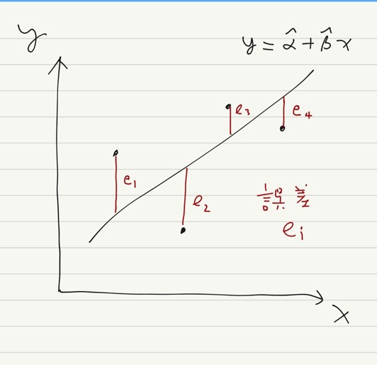 誤差 e とは、予想した回帰曲線と実際の値の y 座標の差をいいます。 $$誤差:e_i = y_i - \hat{y_i}$$