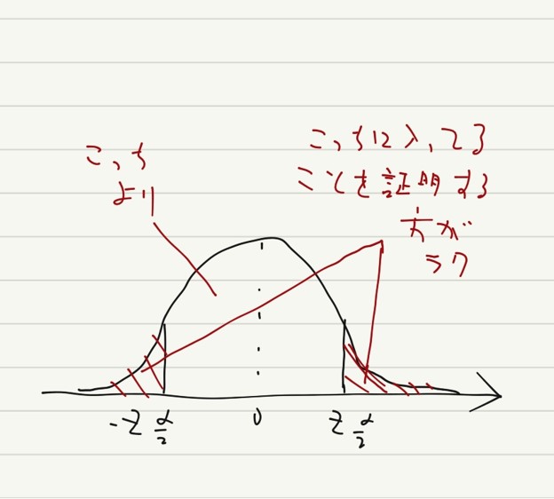 検定統計量が棄却域に入れば(=上の図で赤い範囲に入れば)帰無仮説を棄却、入らなければ帰無仮説を採択するということになります。